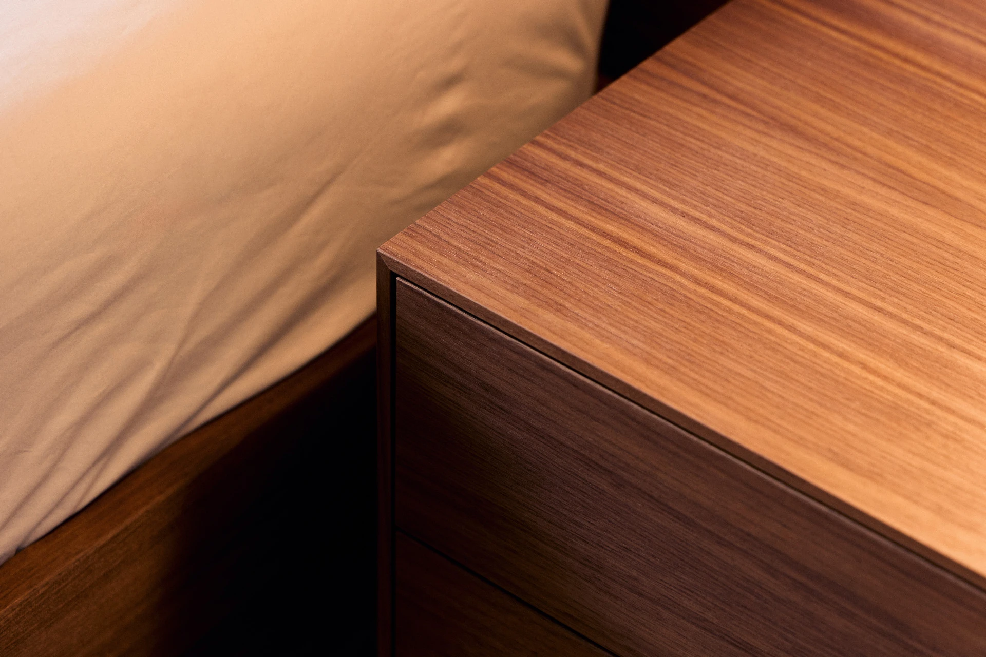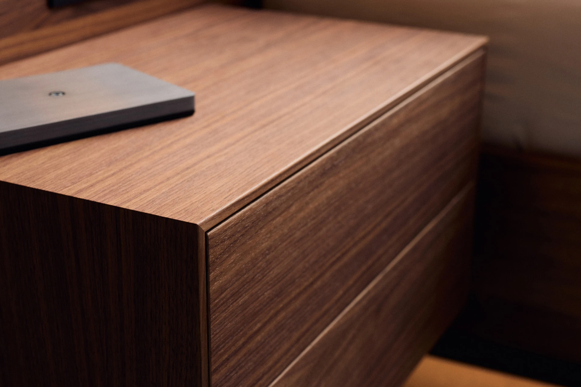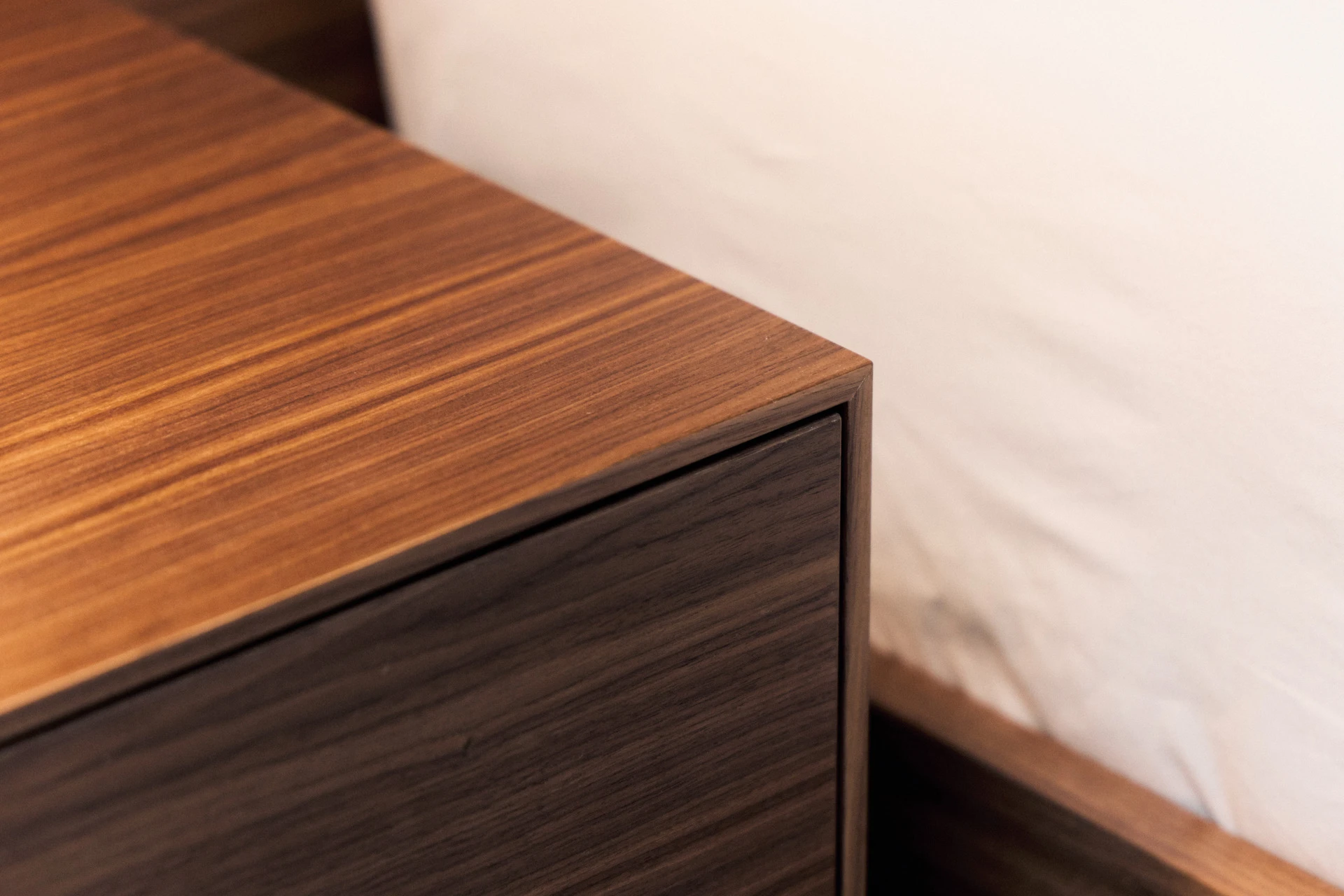 - Nachttisch aus amerikanischem Nussbaum, Schubladenfronten beschichtet mit Fenix NTA, Schublade mit Touch-to-Open und Soft-Close Funktion