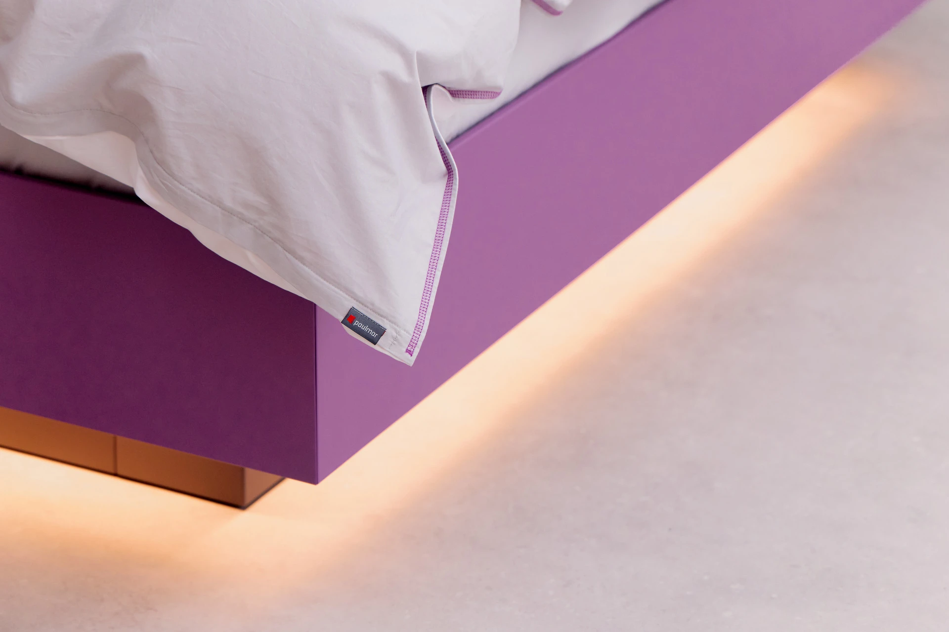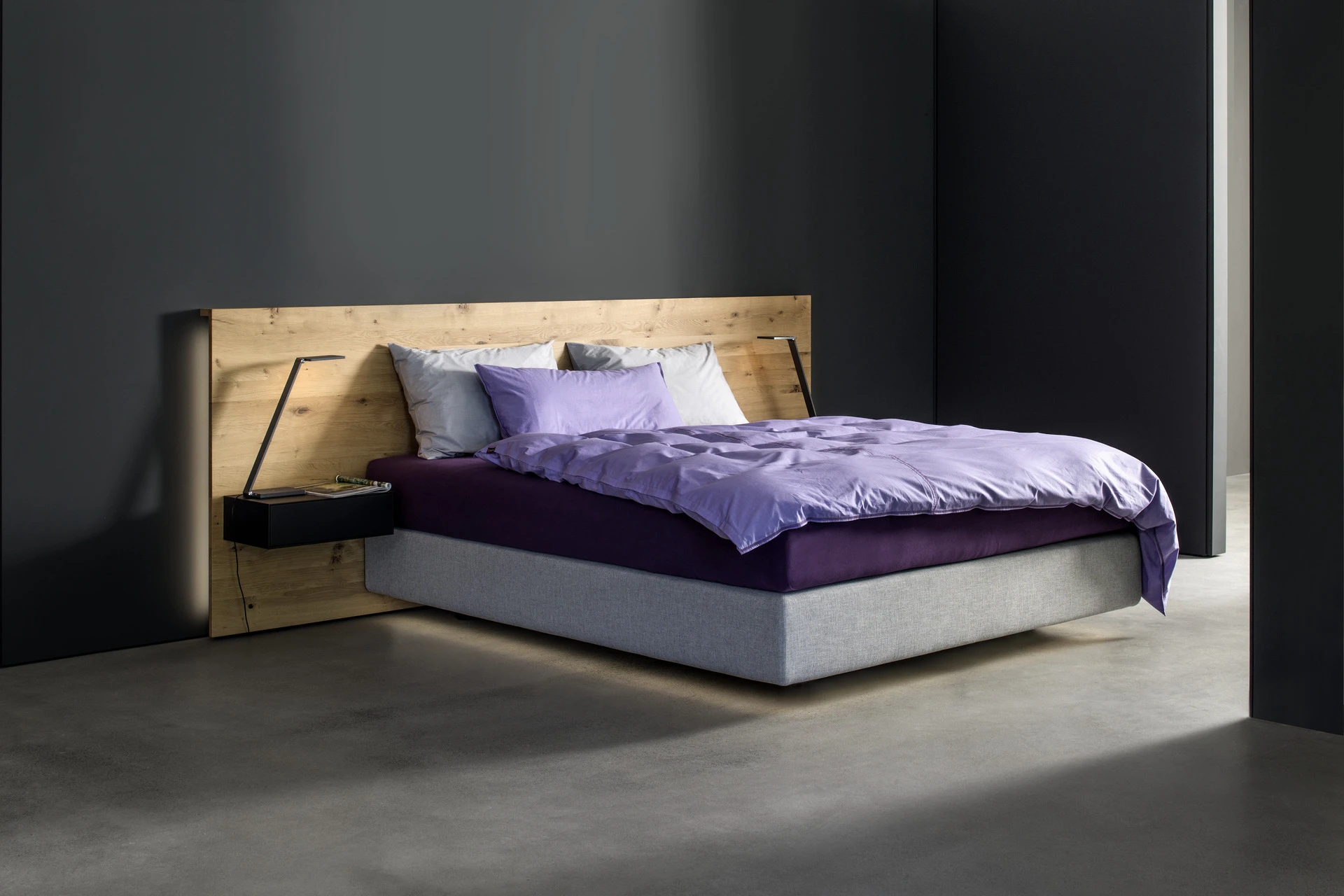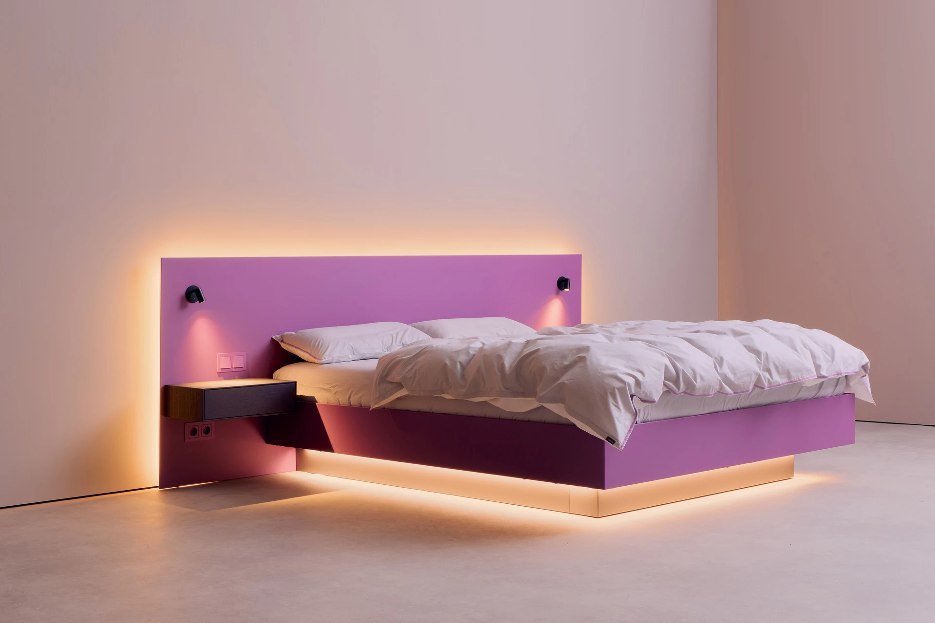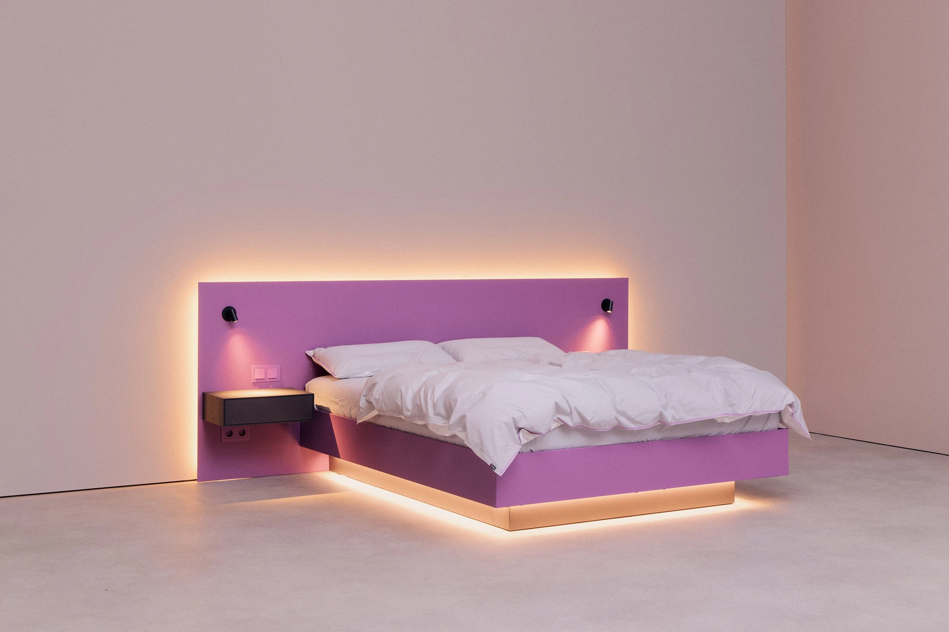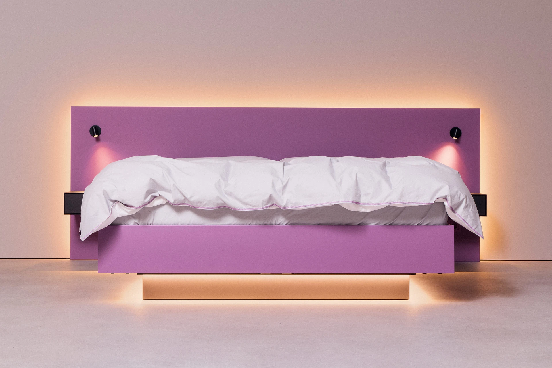 - Bettgestell und Wandpaneel in ultramatter, regenerativer Lackoberfläche in Flieder