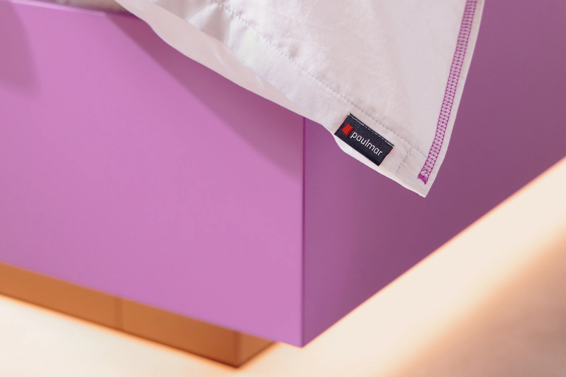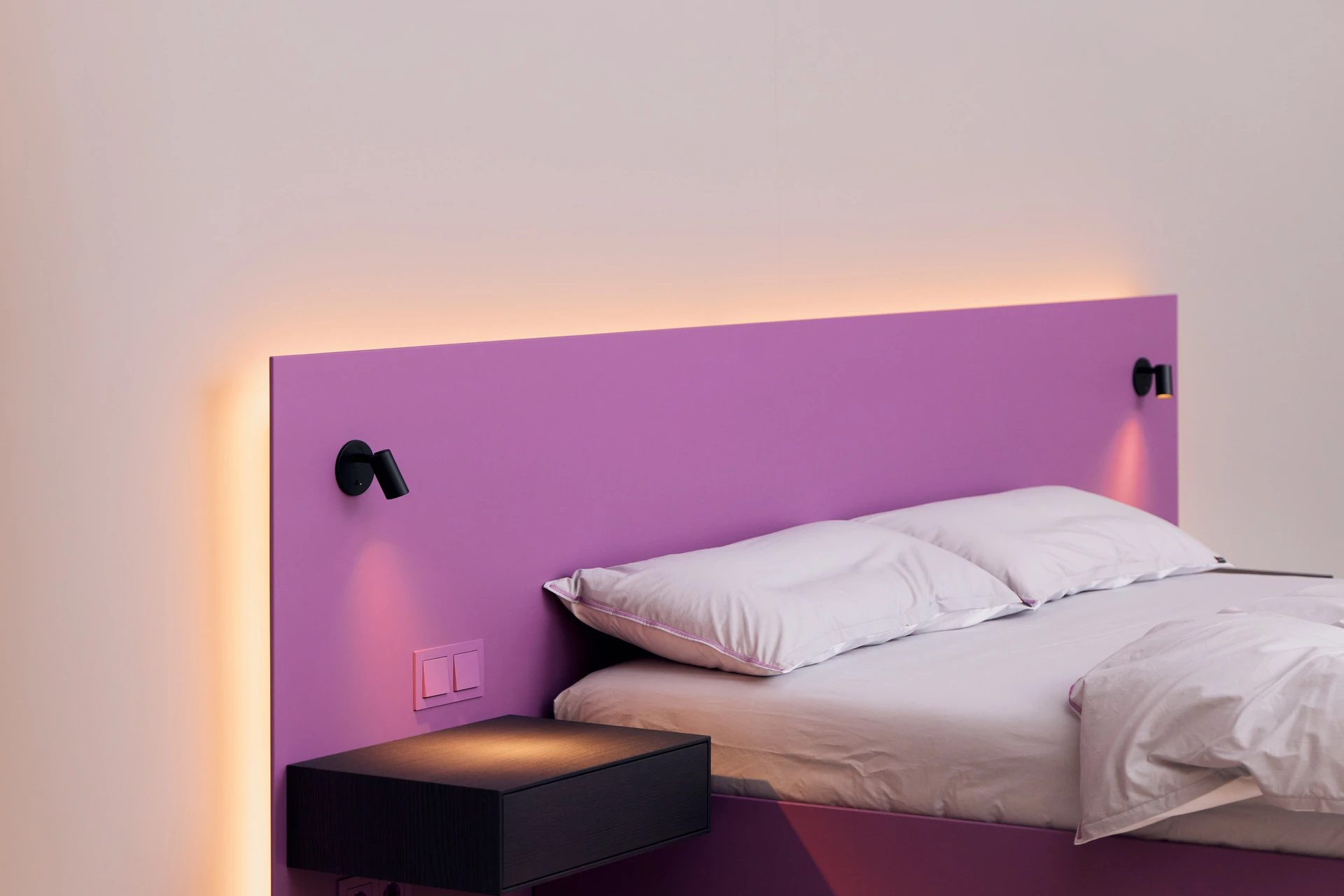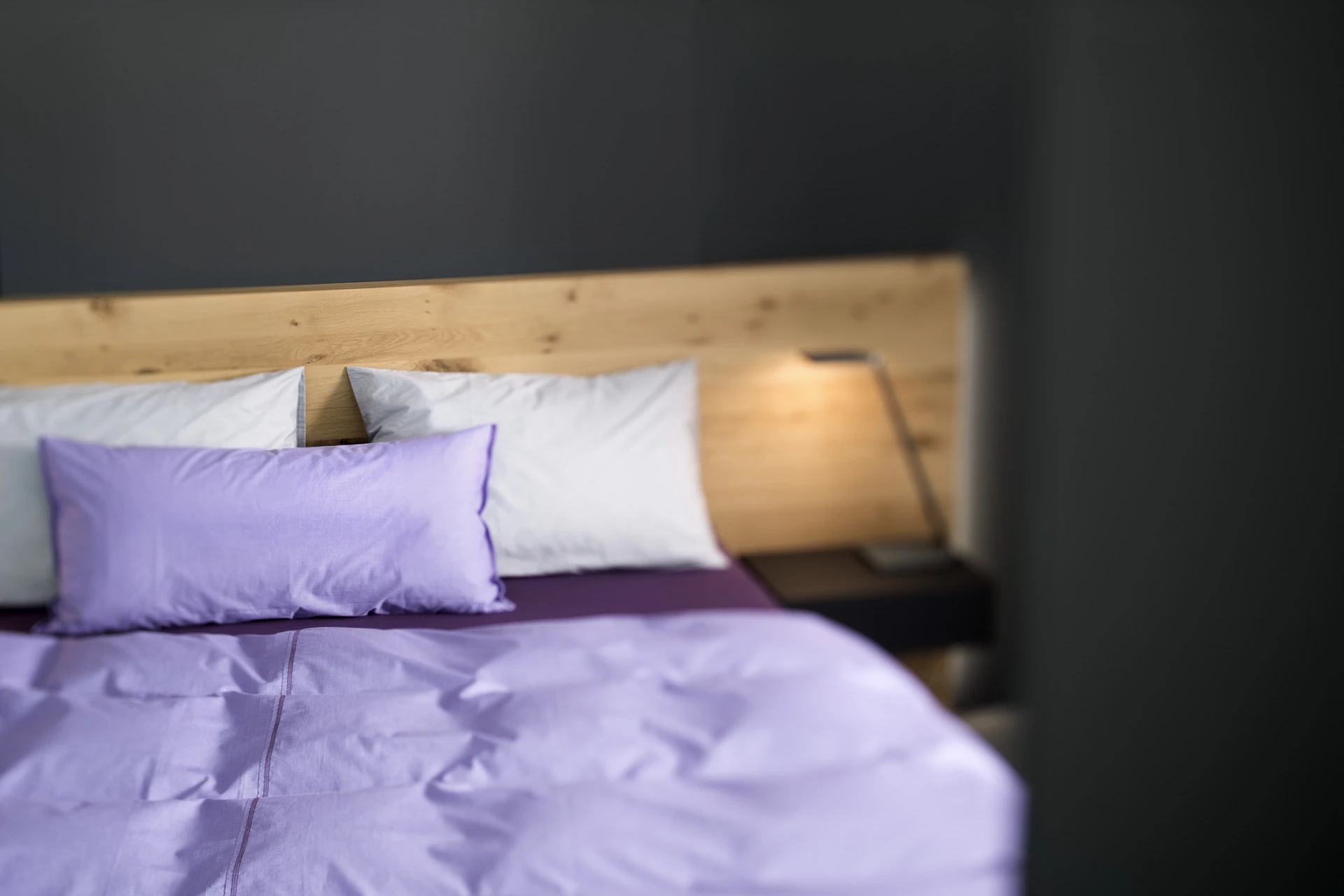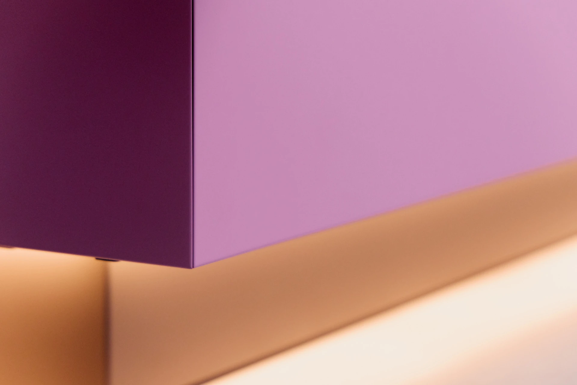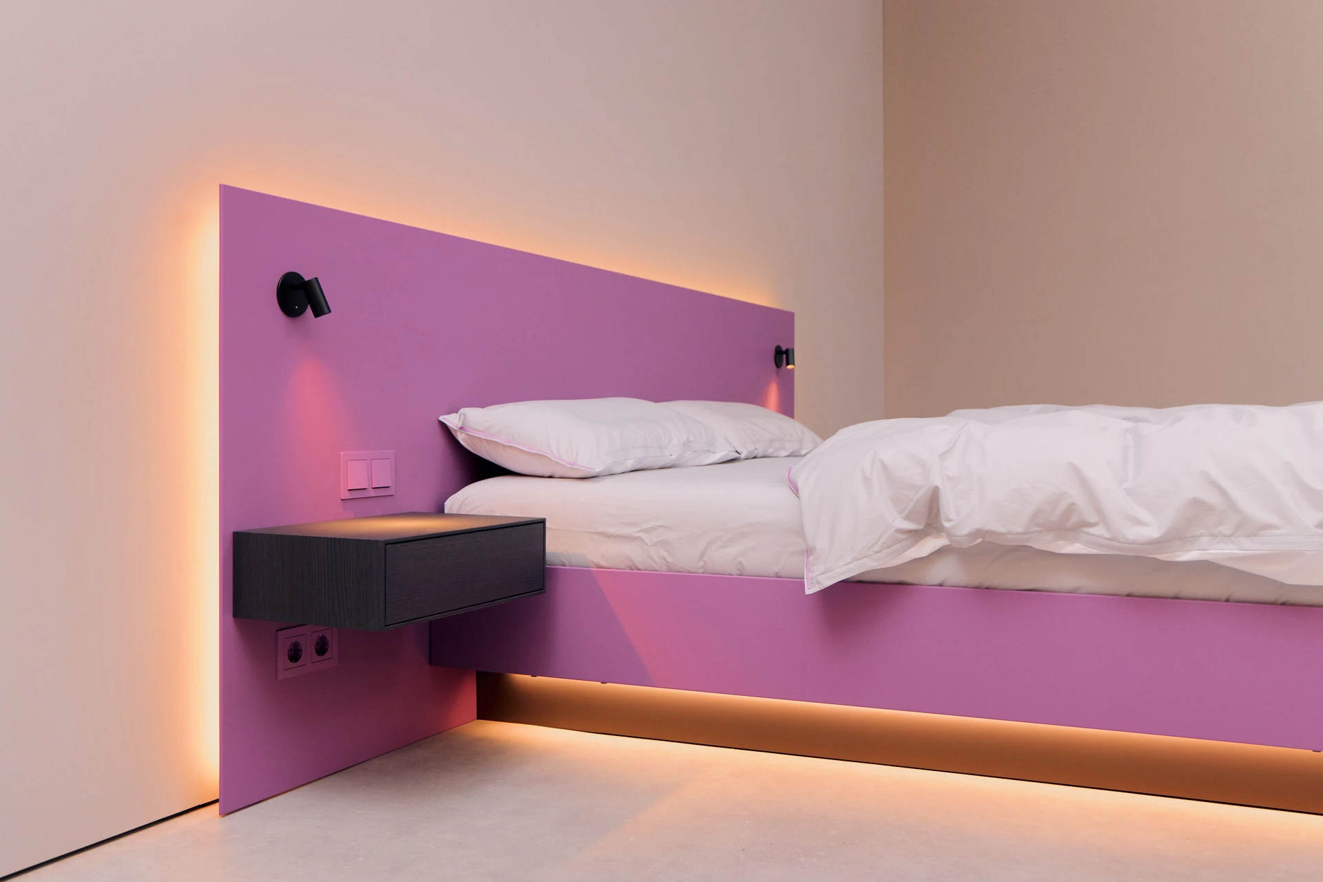 - Bettgestell und Wandpaneel in ultramatter, regenerativer Lackoberfläche in Flieder
