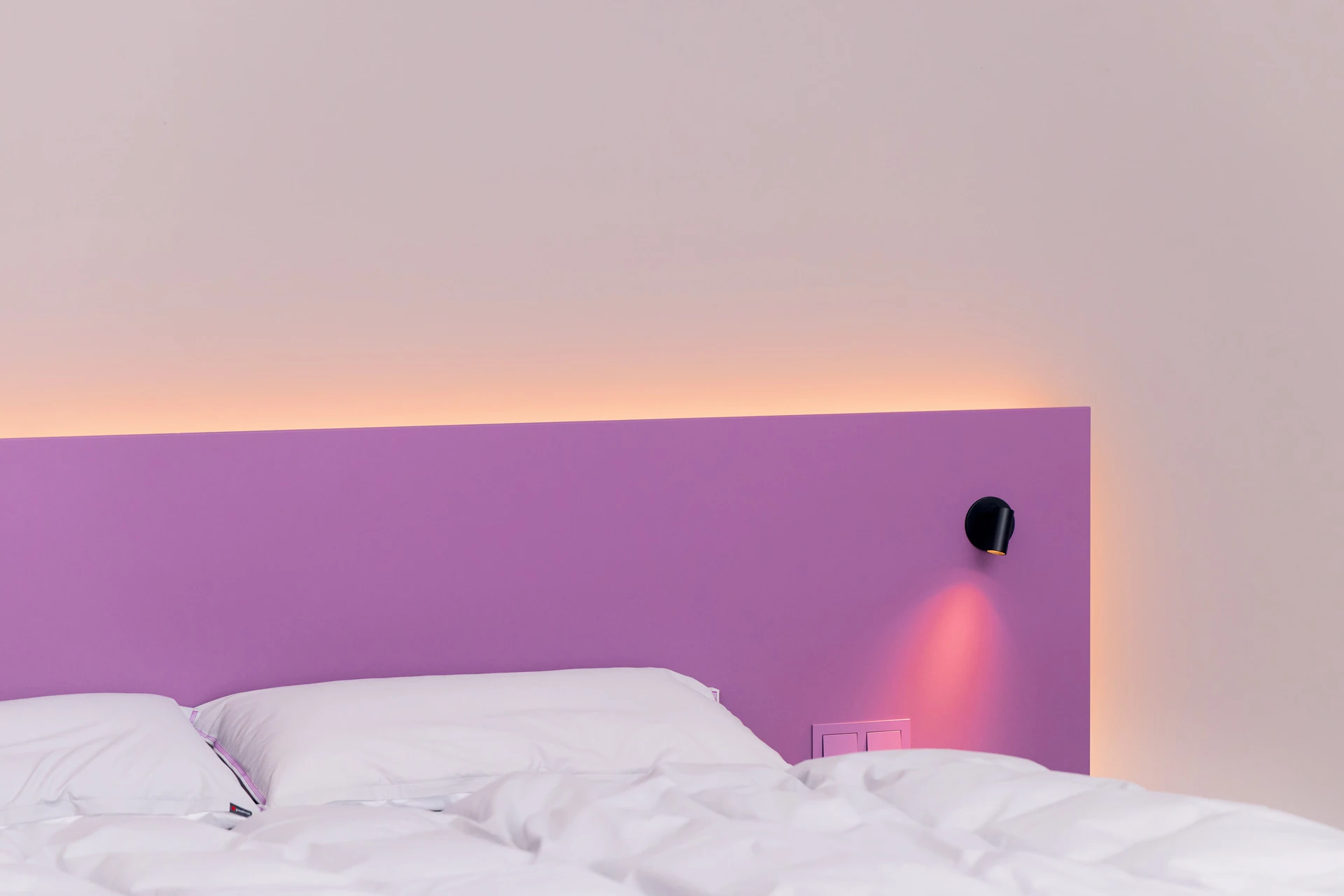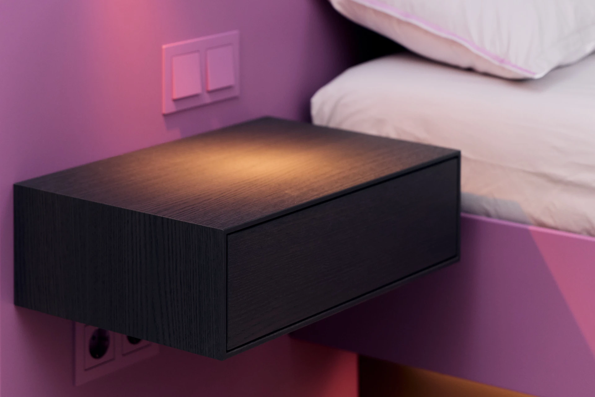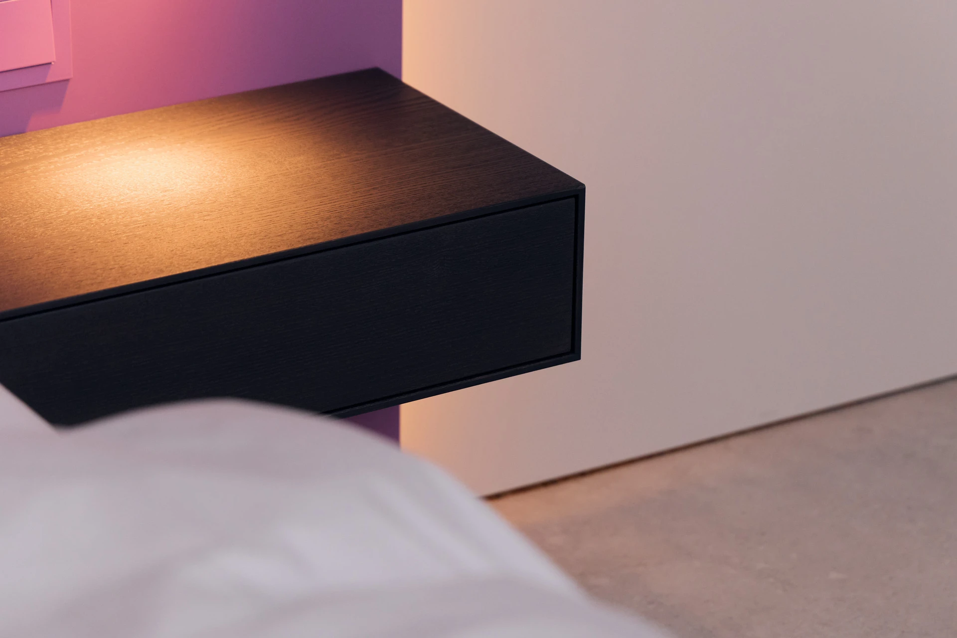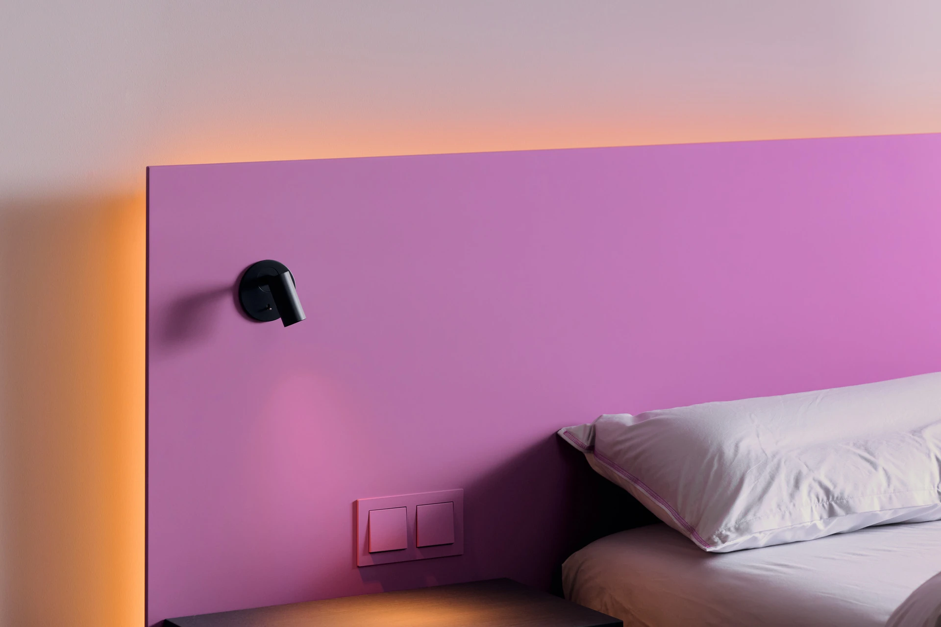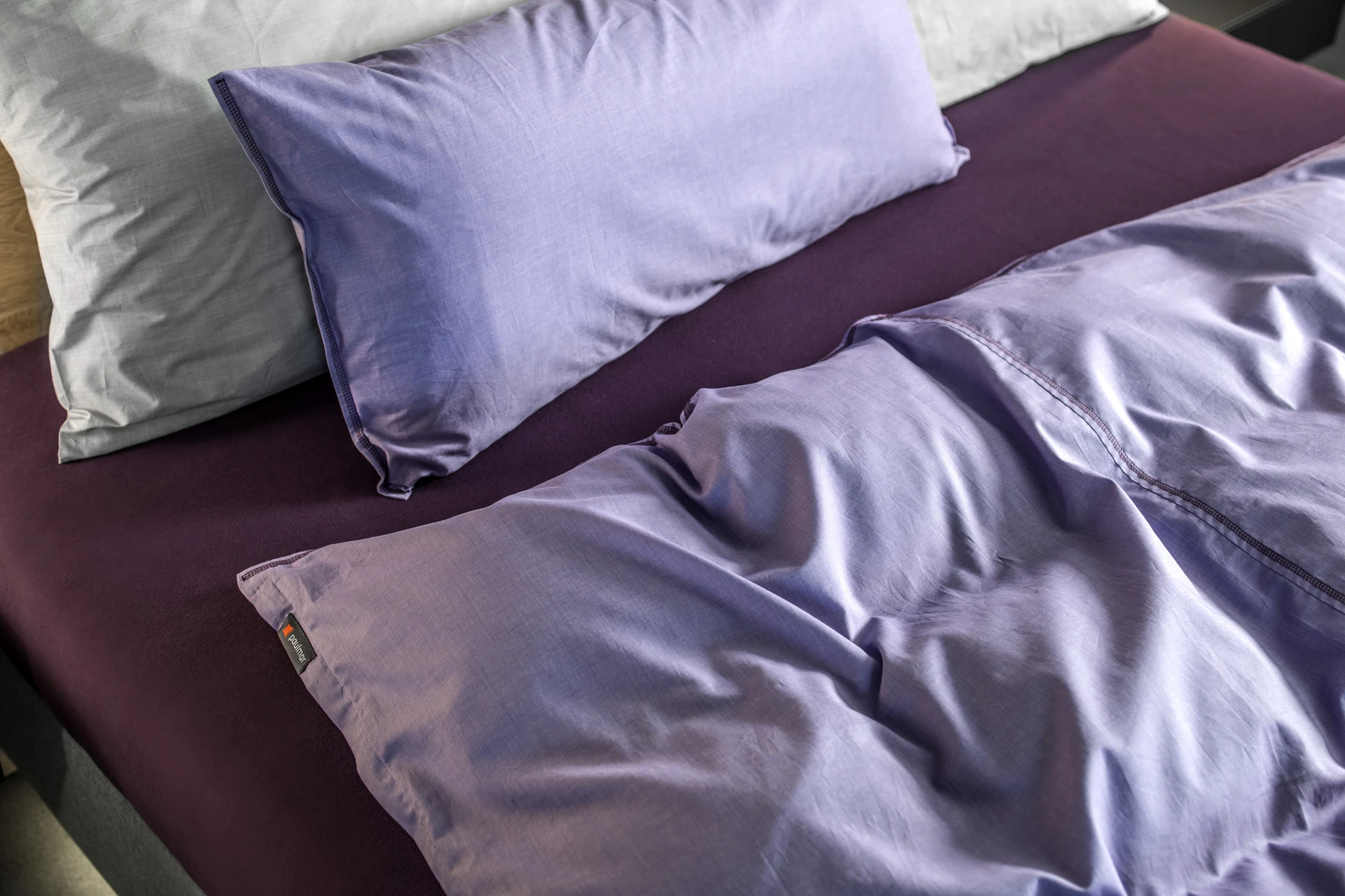 - Bettgestell und Wandpaneel in ultramatter, regenerativer Lackoberfläche in Flieder